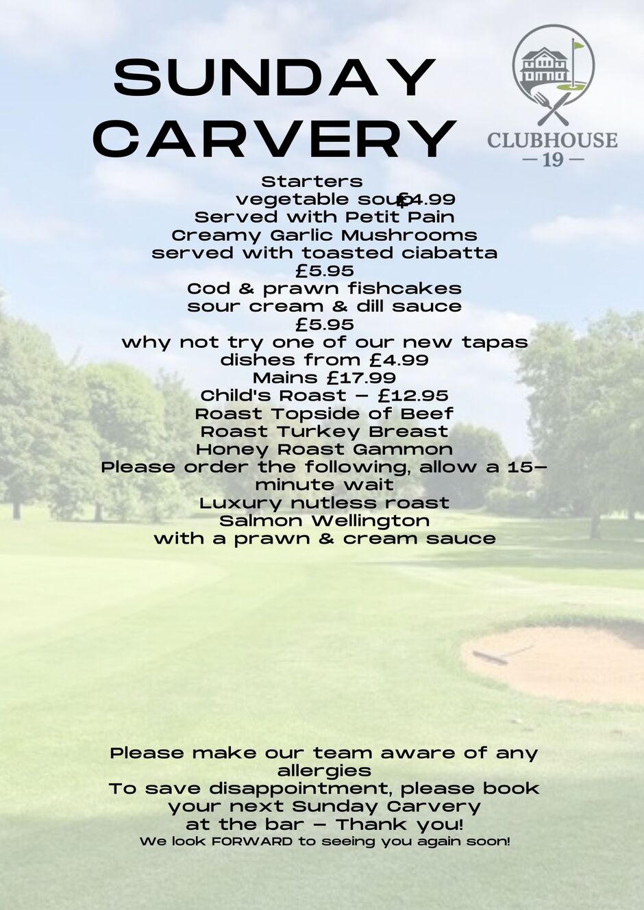 Our menu is seasonal and changes every few weeks, please see below a sample Sunday lunch menu.